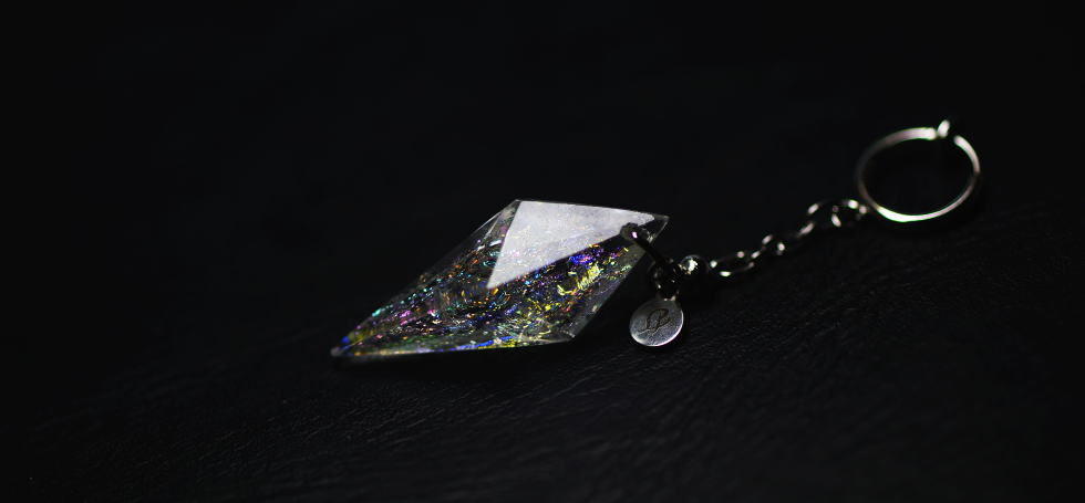 3366 『Resonant pillars』立体造形タイプ長さと仕様が異なる3本のガラスの三角柱。それを包み込むように彫金の枠を施した、オリジナルコラボレーションベルトループアクセサリーが完成いたしました。ガラスの三角柱は、それぞれベースカラーのグラデーションと「ダイクロ偏光ガラス」の煌きを変えてお作りいたしました。それらを辺としたSilver925製のオリジナル金属枠を制作しております。上下から見た際には正三角形に見え、サイドから見た際には長さが異なる仕様としてお作りしております。ステンレス製のオリジナルベルトループチェーンをお付けしております。世界にひとつの逸品をどうぞ末永くお楽しみいただければ幸いです。