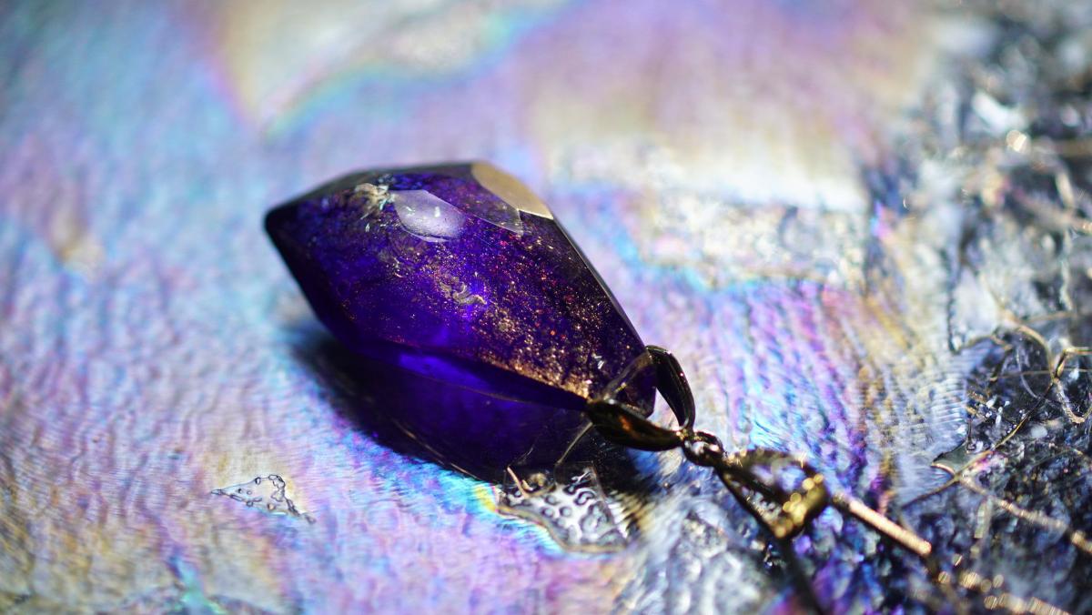 2156 『紫光 ~ 輝きの舞 ~』四角・多角・星タイプ細身の菱形をベースに、表面の四面を深めにカットを施しました。色合いは高貴な紫をベースに、内部には美しく輝く様々なラメを施しました。全体を優しく包み込むようにsilver素材でフレーム枠で囲みました。どこから見てもガラスの色合いをご覧いただけます。また、サイドのフレームの間からは内部のラメの輝きもご覧いただけます。小ぶりでスタイリッシュなペンダントに仕上がりました。末永くご愛用いただけましたら、作り手といたしましても大変い嬉しいです。