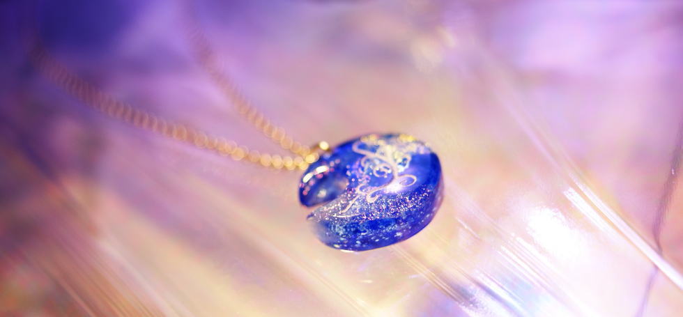 2804 『爽空の煌き』円・楕円・ドロップタイプ透明感のある澄んだ淡いブルーの中に、光の反射でキラキラと煌く優しいイメージの、オリジナルドロップタイプペンダントが完成いたしました。淡い色合いと共にラメや箔などをマーブル模様にしていますので、奥行きのある表情をお楽しみいただけます。また暗闇では神秘的な光を放つ蓄光加工も施しています。末永くお楽しみいただければ作り手として大変嬉しく思います。