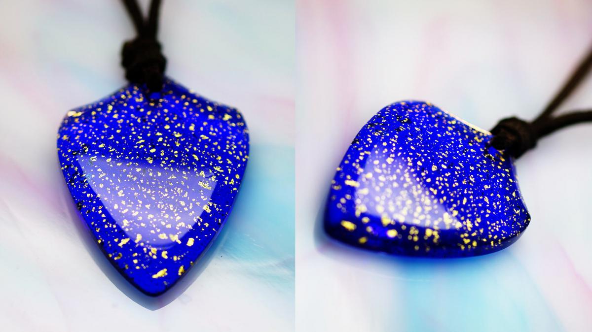 - 破損された思い出の琉球ガラスのグラス。新たに形を変えて世界にひとつのエンブレムペンダントへとリメイクいたしました。コバルトブルー系の色味と内部の金箔の美しさを活かしてお作りした逸品です。同時にお作りしましたオブジェと共にぜひ末永くお楽しみいただければ幸いです。
