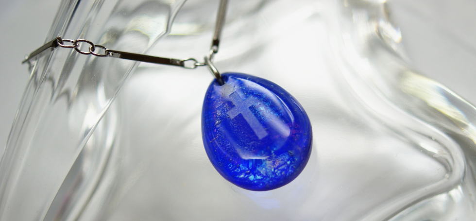 - コバルトブルーをベースに内部には美しく輝くレインボーのラメを施しました。光のあたり方や見る角度で輝きの色合いが変わります。太陽光の下では一層美しく輝きます。表面にはクロスの彫刻を施しました。素敵なドロップタイプのネックレスです。