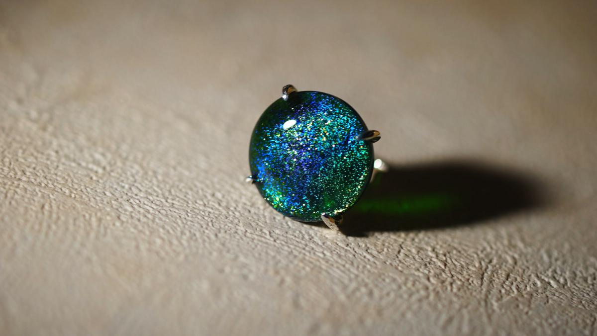 - アベンチュリングリーンの繊細な煌きと「ダイクロガラス」の神秘的な煌きが織りなす美しい煌きをご堪能いただける、世界にひとつのオリジナルリングが完成いたしました。繊細なオリジナルリングベースに設置した存在感のあるトップ。ぜひ様々なシーンでその煌きをお楽しみいただければ幸いです。