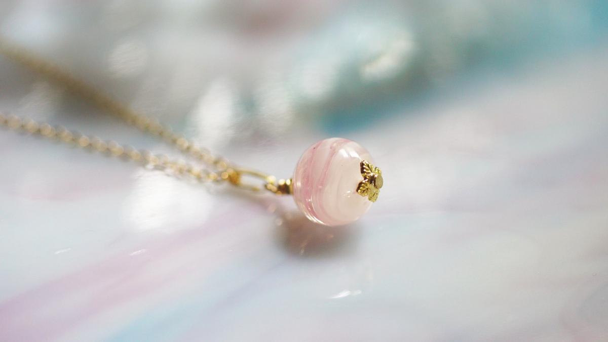 - 球体のフォルム。半透明ホワイトにピンク色を少し加え優しい雰囲気に仕上げました。ガラスの内部に大切なご家族の「思い出の大切なもの」を封入しお作りした、世界にひとつのメモリアルペンダントです。見る角度により異なるマーブルの表情をぜひお楽しみいただき、作品を通じて少しでも大切な存在を身近に感じていただければ幸いです。