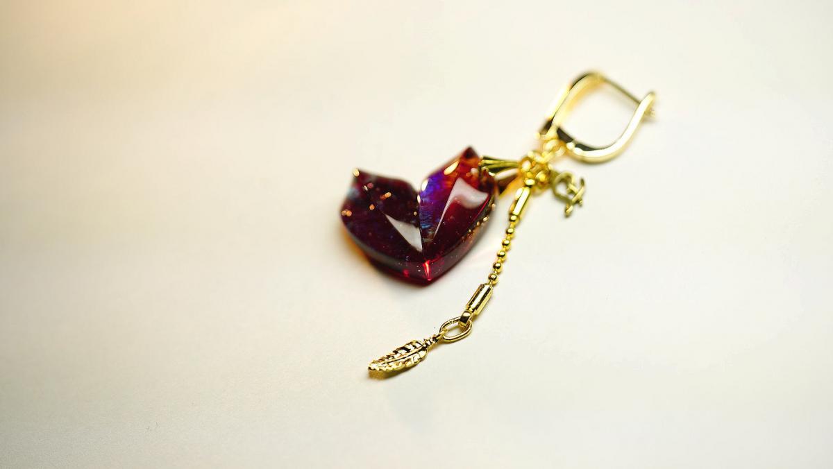 - 繊細な花びらのようなフォルムと、大人の雰囲気漂う気品のある色味。可愛らしさと優美さを兼ね備えたハート型片耳用ピアスです。透明感のあるレッドをベースカラーにしっとりとした上品な煌きを施しています。光に翳したり透かしたり、その都度様々な表情をお楽しみいただける逸品を ぜひお楽しみください。