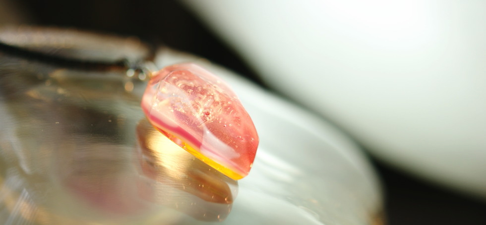 - アイスロックカットを施し優しいピンク、元気の出るサンフラワーイエロー、純真なホワイトなどを使用し、品良くラメをお入れしてクリアーで包みました。内部には半球の丸いフォルムが蓄光でホタルのような神秘的な光を放つように施しました。日中は太陽光の光の下で是非ご覧ください。優しい光が広がってご覧いただけます。素敵なネックレスです。