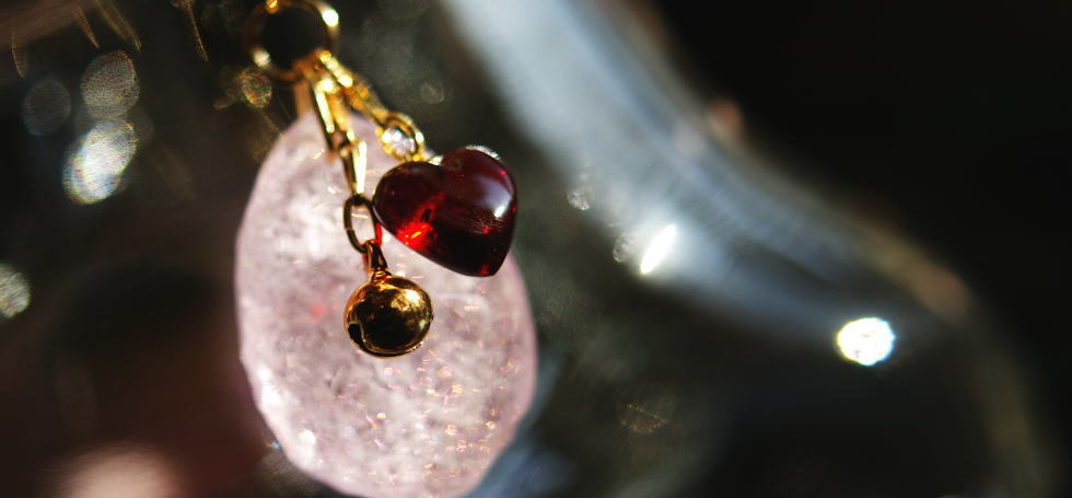 - 淡いピンク色をベースにダイクロ偏光ガラスと蓄光を施したアイスロック調カットをした封入しずくに、可愛らしいハートと鈴を付けた、太目のチェーン付きバッグチャームです。ふっくらしたしずくは淡く美しいピンクをベースにいたしました。大変美しいガラスの王様と呼ばれるダイクロ偏光ガラスのピンク系を使用しています。太陽光の下では一層美しく輝きます。濃い目のピンクから淡いグリーン、ゴールドなどに偏光いたします。ふっくらした可愛らしいハートは、ガーネットレッドをベースにしています。また可愛らしい鈴のチャームも付けています。光を吸収する度にホタルのような神秘的な光を放つ蓄光は、ライトスカイブルー系の色合いの神秘的な光を放ちます。