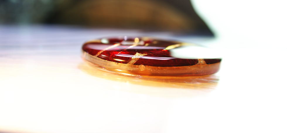 - お手持ちのベネチアンガラス製アクセサリーをベースに、フォルムや色合いを変え、ガラスの内部に何層にも施しました。焼成時の高温の炉内で自然にクラッキングした金箔が眩い美しさです。裏面には、ネックレスの一部にお使いいただけるよう、テグスなどの糸通し穴を貫通させています。また20mmφ程の穴を開けていますので、革紐などを絡めて、単独でペンダントとしてもお使い頂けます。