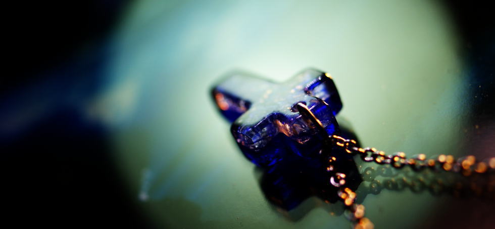 392 『Mystic glow』円・楕円・ドロップタイプコバルトブルーをベースに内部には美しく輝くレインボーのラメを施しました。光のあたり方や見る角度で輝きの色合いが変わります。太陽光の下では一層美しく輝きます。表面にはクロスの彫刻を施しました。素敵なドロップタイプのネックレスです。