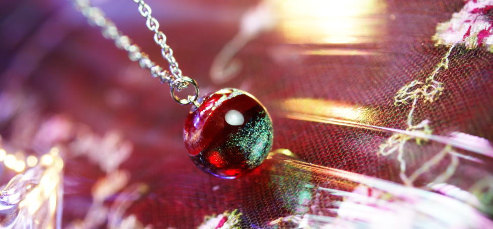 - 惑星を小さくした様な球体作品です。濃い目の赤のガーネットレッドをベースに、ガラスの王様と呼ばれるダイクロ偏光ガラスを加えて大胆なマーブル加工をいたしました。内部には光を吸収する度に暗闇でホタルの光のように神秘的に光る蓄光加工をいたしました。胸元に素敵なネックレスです。