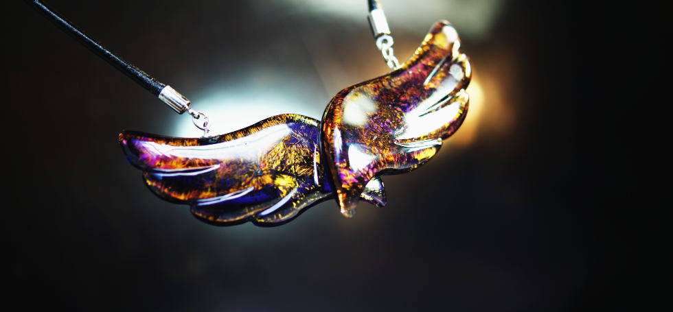 - 今にも空に飛び立とうとするような美しい二枚の羽は、ゴールドやパープルなど様々な色合いに輝いています。太陽光では一層美しく輝きます。光を透過しますとベースの美しいパープルがご覧頂けますとても美しく優雅な羽タイプネックレスです。